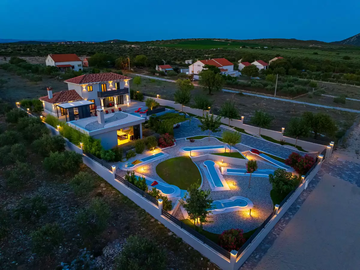 Ova moderna vila nudi sve što vam je potrebno za opuštajući odmor, od potpuno opremljene kuhinje do udobnog vanjskog prostora s bazenom, biljarom ili mini golfom.